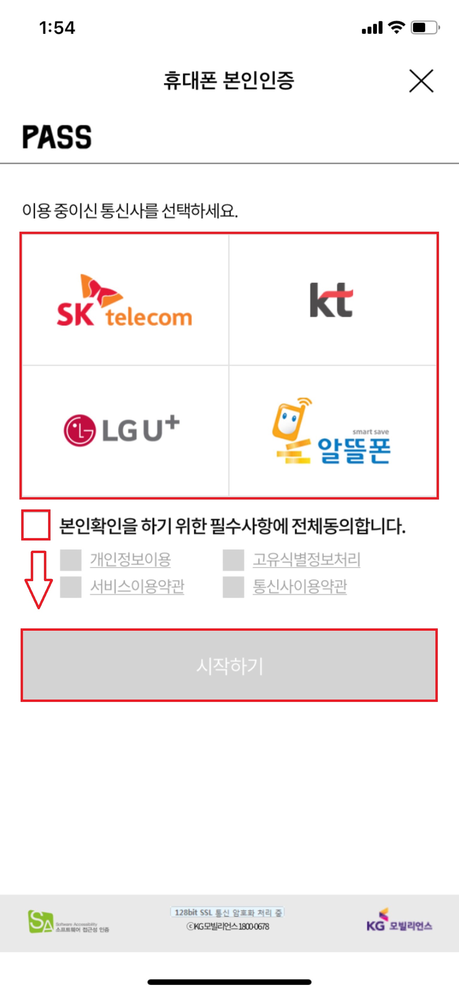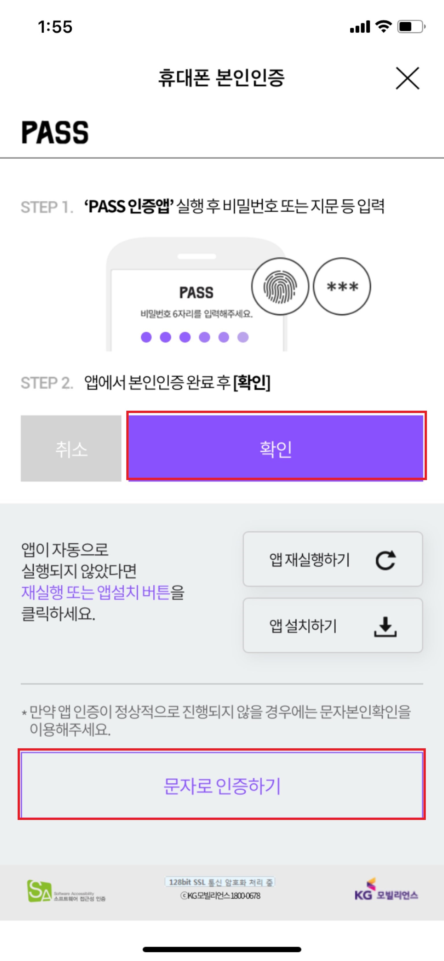 4. [PASS 인증앱] 또는 [문자인증]을 통해 인증을 완료해줍니다.