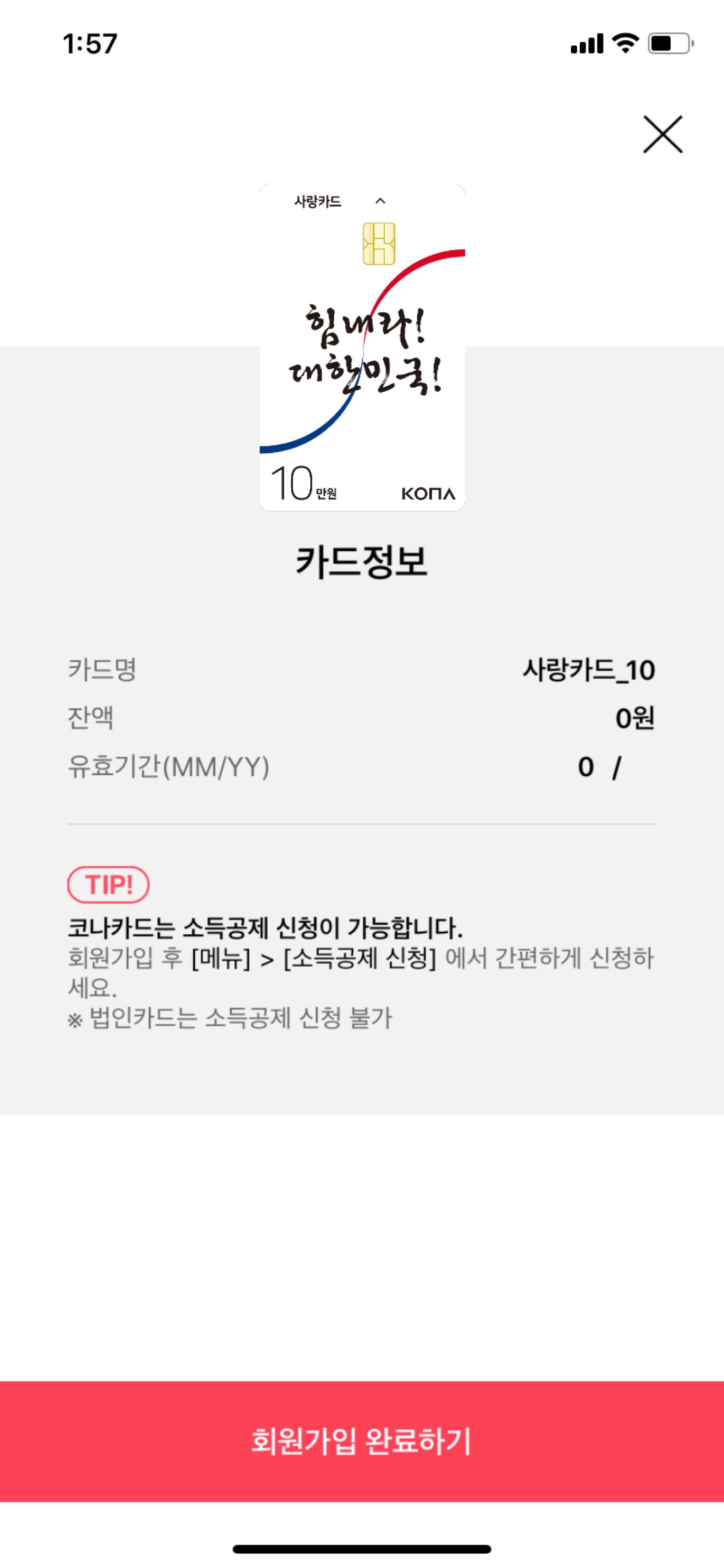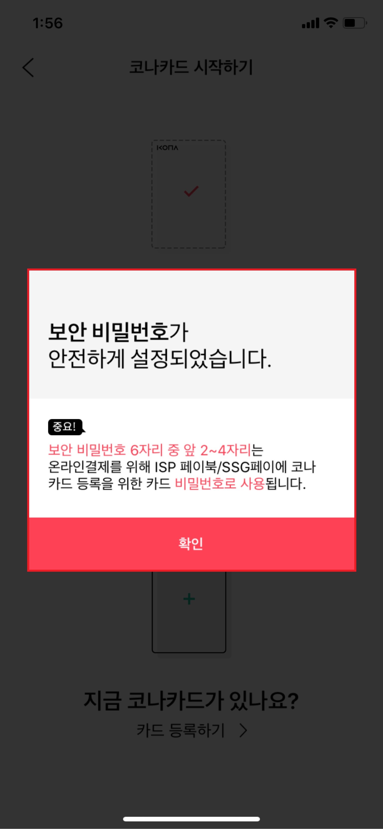 8. 이렇게 해서 코나카드 회원 설정완료! [확인]을 눌러주세요.