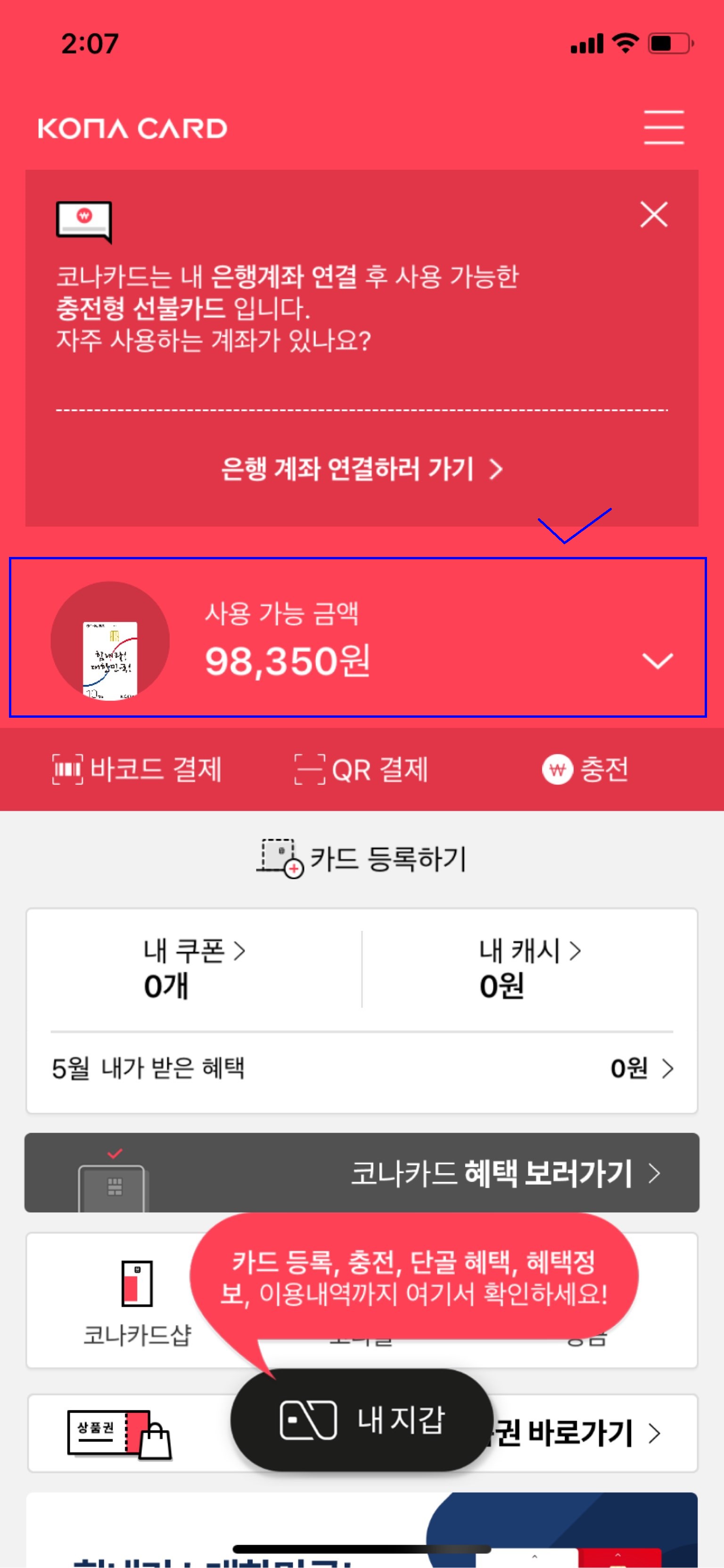 8. 로그인 화면 중앙에 등록 된 카드의 [잔액]이 확인되네요.