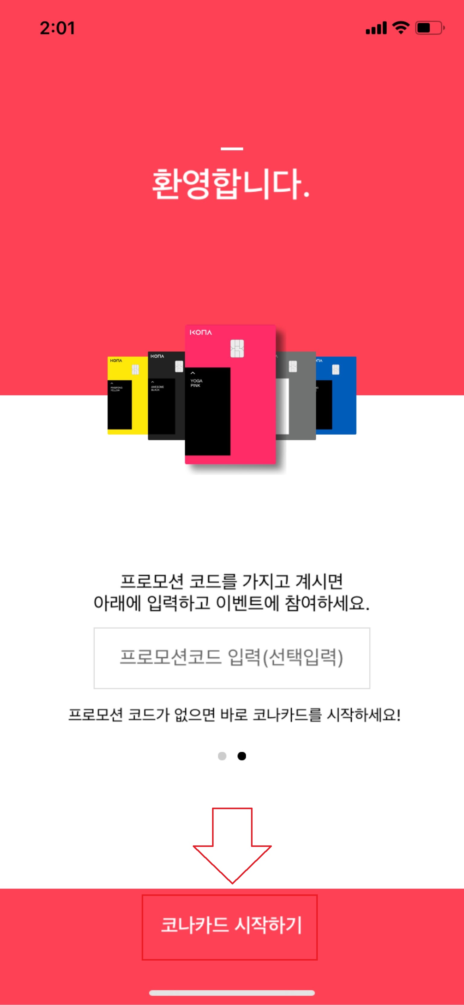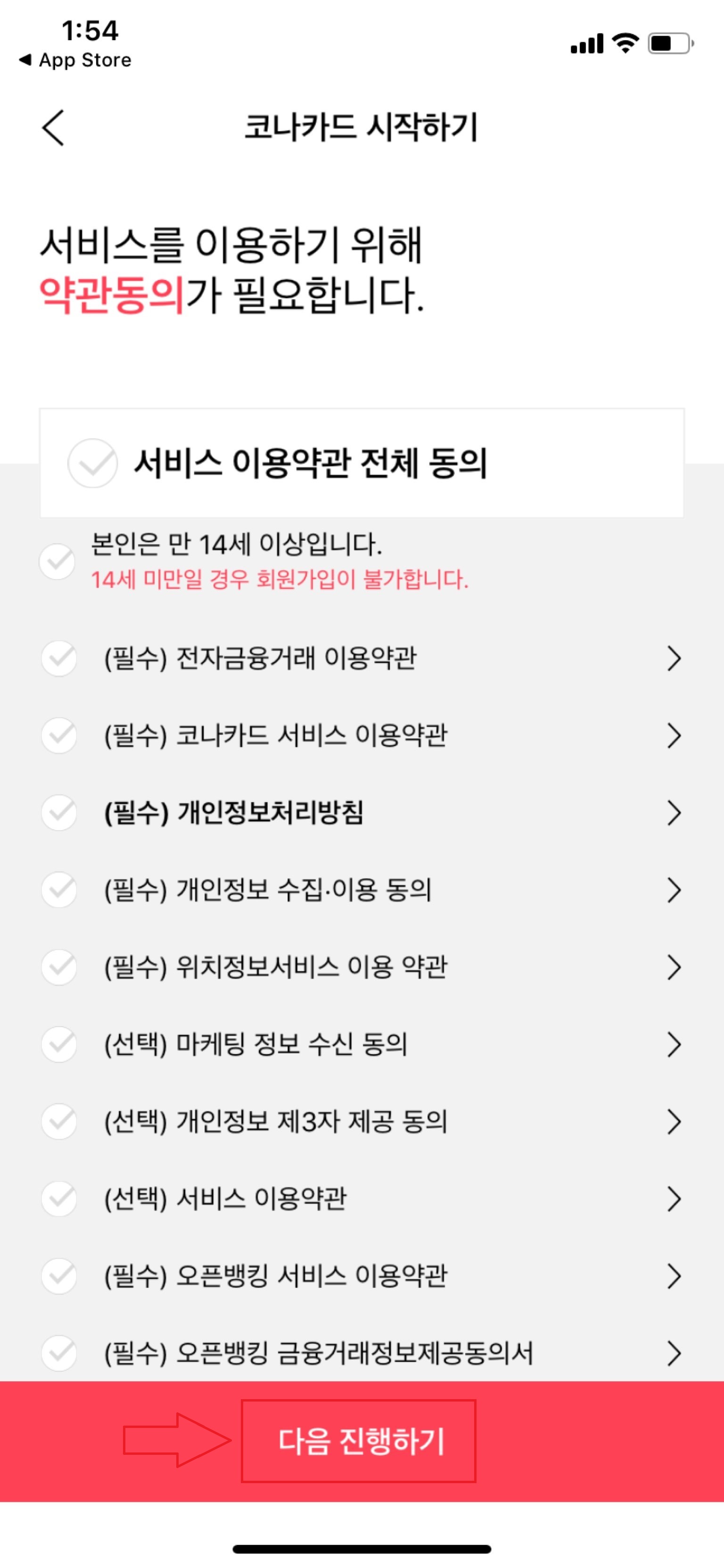 1. [코나카드] 앱에서 [약관 동의]하고, [다음 진행하기]를 눌러줍니다.